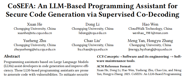 近日,云從科技與重慶大學大數據與軟件學院聯合研發的編程智能體——CoSEFA(Code SEcurity and Fix Agent)被軟件工程領域頂尖會議ACM SIGSOFT軟件工程基礎國際會議(FSE 2025)正式錄用。